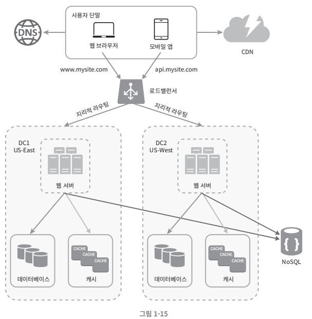 - 데이터 동기화(synchronization): 각 데이터 센터마다 별도의 DB를 사용하는 경우, 장애가 자동으로 복구되어(failover) 트래픽이 다른 DB로 우회된다 하더라도 해당 데이터센터에 찾는 데이터가 없는 경우가 발생한다. 이를 막는 보편적 전략은 데이터를 여러 데이터센터에 걸쳐 다중화하는 것이다.(넷플릭스의 데이터센터 다중화 참고)