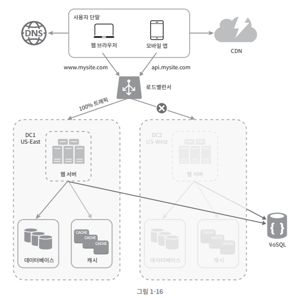 - 트래픽 우회: 올바른 데이터 센터로 트래픽을 보내는 효과적인 방법을 찾아야 한다. 예로 GeoDNS는 가장 가까운 데이터센터로 트래픽을 보낸다.