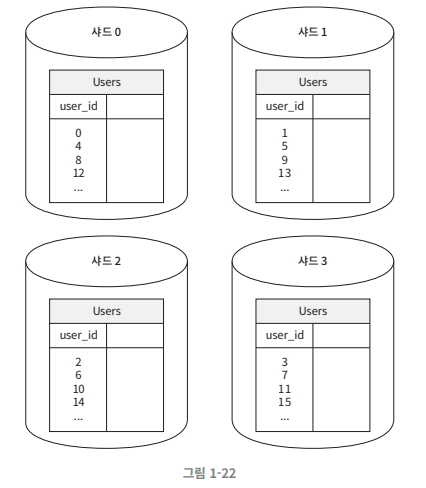 데이터베이스의 수평적 확장은 샤딩(sharding) 이라고도 부른다. scale-out이란 더 많은 db 서버를 추가함으로써 성능을 향상시키는 방법이다. 샤딩은 대규모 DB를 샤드(shard)라고 부르는 작은 단위로 분할하는 기술이다. 모든 샤드는 같은 스키마를 쓰지만, 샤드에 보관되는 데이터 사이에는 중복이 없다.