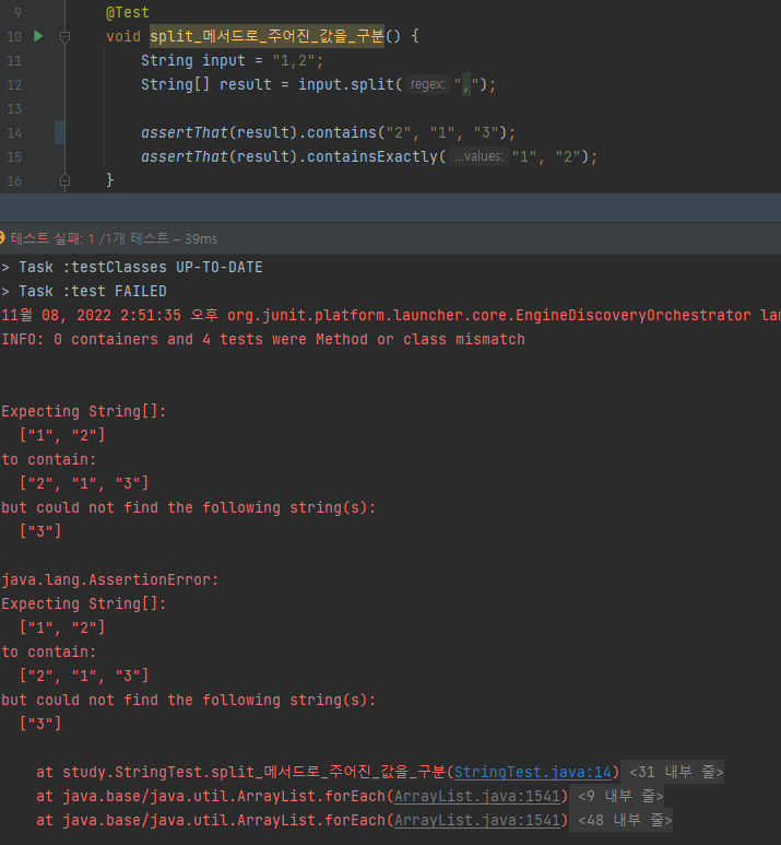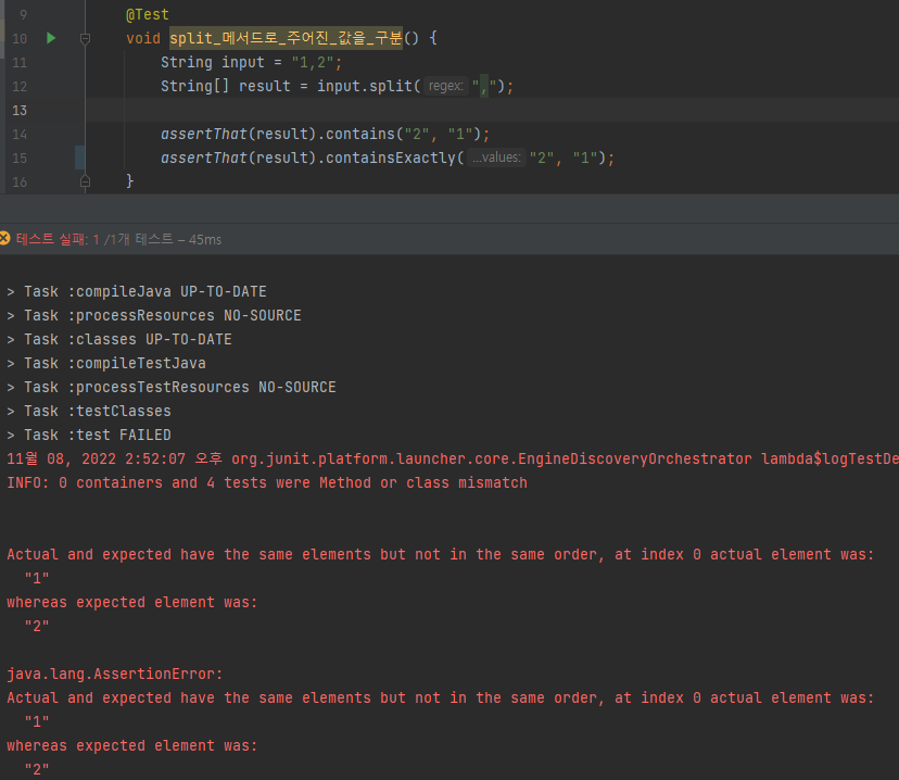 이번에는 containsExactly() 메서드의 "1" 과 "2"의 순서를 바꿔보았다.