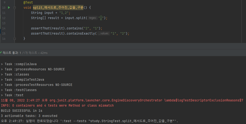 첫번째 테스트 코드는 assertThat() 메서드의 인자로는 result 배열을 넣어 주었고, contains("2", "1") 메서드를 통해 배열이 해당 요소들을 포함하고 있는지를 테스트하는 코드이다.