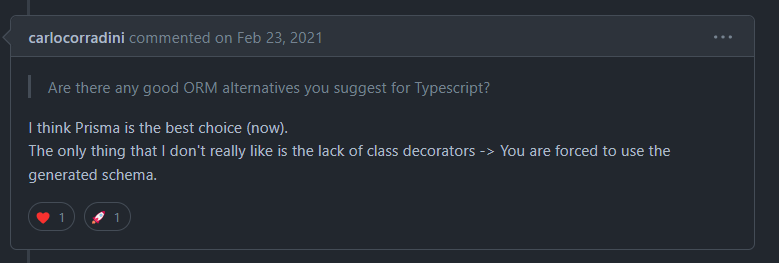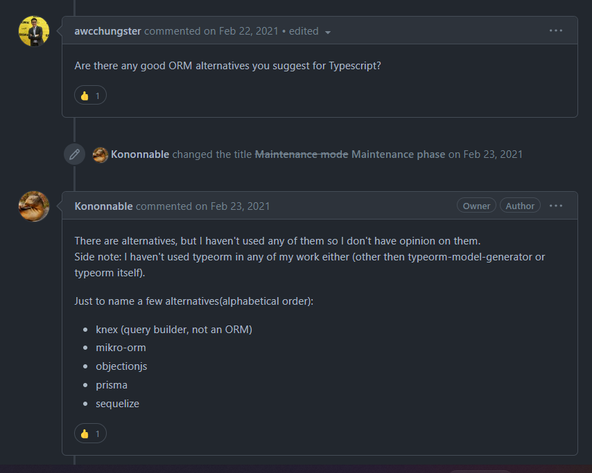 그리고 많은 유저들은 TypeORM이 아닌 prisma나 sequelize 등 다른 ORM 도구들을 추천해주었다.