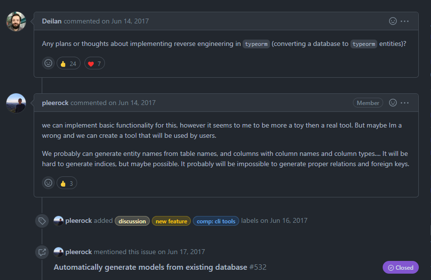 2017년 어떤 사용자가 database에서 typeorm entities로 전환하는 reverse engineering 도구의 개발 계획을 물어본 적이 있다. 실제 도구로 사용하기보다는 장난감처럼 사용할 수 있겠다는 결론이 답으로 도출이 되어서 아쉽다고 생각했는데...