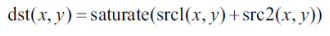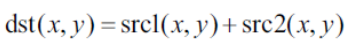 두 입력 영상(src1, src2) 에서 같은 위치 픽셀 값을 서로 더하여 결과 영상 픽셀값(dst(x,y)) 으로 설정하는 연산이라 할 수 있다.