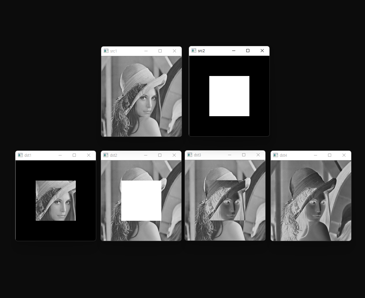 AND 연산의 결과 영상(dst1)의 경우 square 이미지에 의해 사각형 영역의 바깥 배경 영역에 대해 비트가 0을 하나라도 포함하므로 연산 결과가 0으로 나타나 검정색 배경에 대해서는 그대로 검정색 배경이 나타나는 것을 확인할 수 있다.