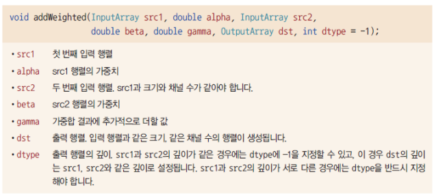 두 영상의 가중치 합을 구하려면 addWeighted() 함수를 사용한다. 함수의 원형은 다음과 같다.