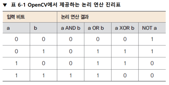 OpenCV에서는 다양한 논리 연산 중 논리곱(AND), 논리합(OR), 배타적 논리합(XOR), 부정(NOT) 연산을 지원한다.