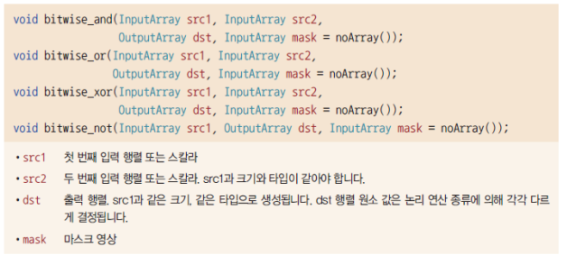 OpenCV 에서는 영상의 비트 단위 논리 연산을 수행하는 bitwise_and(), bitwise_or(), bitwise_xor(), bitwise_not() 함수를 제공한다.