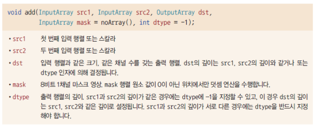 add() 함수에서 mask와 dtype 인자는 기본 값으로 가지고 있는데, src1와 src2 행렬 깊이가 서로 다른 경우에는 dtype 인자를 반드시 지정해줘야 한다.
