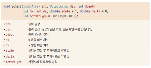OpenCV는 소벨 마스크 이외에도 샤르 필터(Scharr filter) 마스크 를 이용한 미분 연산도 지원한다.