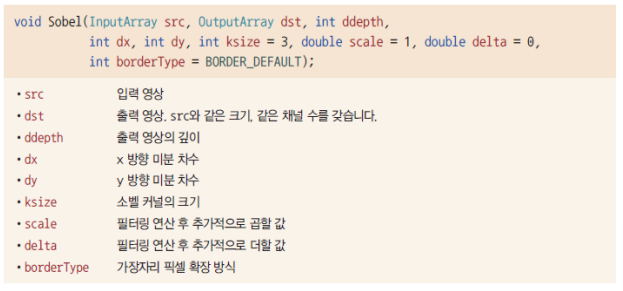 OpenCV는 소벨 마스크를 이용해 영상을 미분하는 Sobel() 함수를 제공한다. 이는 3x3 소벨 마스크 또는 확장된 형태의 큰 마스크를 이용해 영상을 미분한다.