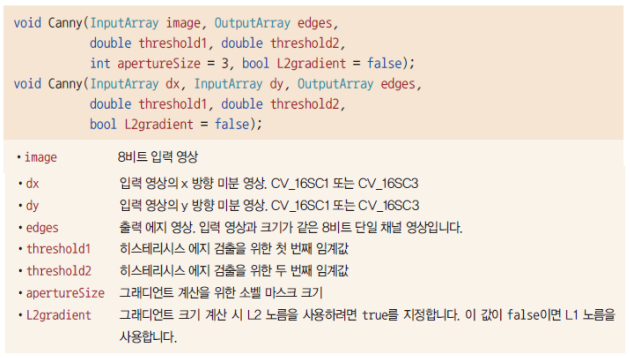 첫번째 Canny() 함수는 일반 영상을 입력으로 전달하여 에지를 검출할 때 사용하고, 두번째 함수는 이미 x,y방향의 미분 영상을 가지고 있을 때 사용한다.