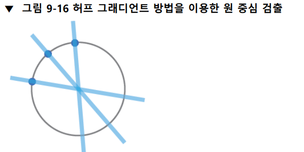 위 그림과 같이, 원주상의 모든 점에 대해 그래디언트 방향의 직선을 그리고, 직선상의 축적 배열 값을 증가시키면 결과적으로 원의 중심 위치에서 축적 배열 값이 가장 크게 나타난다.