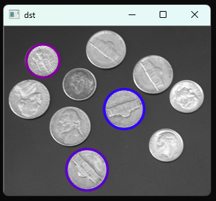 이번에는 두 원의 중심 점 거리 minDist를 100으로 바꾼 결과이다. 가까운 곳에 위치한 일부 동전이 원으로 검출되지 않은 것을 확인할 수 있다. 이를 통해 영상에 나타나는 원들과의 가까운 정도를 미리 알고 있다면 minDist를 적절히 조절하거나, 원의 크기를 미리 알고 있어 minRadius, maxRadius를 적절히 조절한다면 연산량을 효율적으로 줄일 수 있을 것으로 보인다.