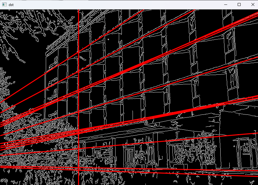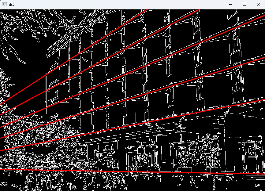 HoughLines() 함수로 구하여 얻은 직선 정보들을 담는 lines에는 각 직선에 대하여, 직선의 방정식 파라미터의 ρ와 θ 의 값이 저장되어 있다. 이를 이용해 원점에서 수선의 발을 내려 만나는 좌표 (x0, y0)을 구하고, 이 점에서 충분히 멀리 떨어져 있는 직선 위의 두 점을 구하여 line() 함수를 이용해 빨간색 실선으로 나타냈다.