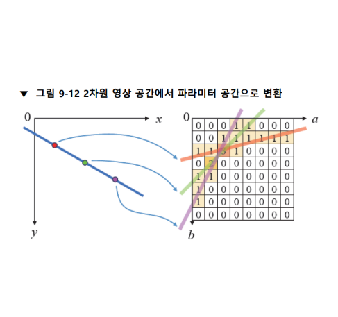 결과적으로, 오른쪽 그림에 나타난 배열이 축적 배열이고, 축적 배열에서 최댓값을 갖는 위치에 해당하는 a와 b 값이 xy 공간에 있는 파란색 직선의 방정식 파라미터이다.