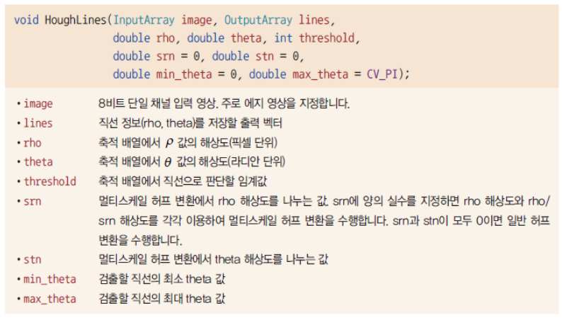 첫번째 인자인 image에는 보통 Canny() 함수 등을 이용해 구한 에지 영상을 지정한다. image 영상에서 0이 아닌 픽셀을 이용해 축적 배열을 구성한다. 직선 파라미터 정보를 받아올 lines 인자에는 보통 vecor<Vector2f> 또는 vector<Vector3f> 자료형의 변수를 지정한다. <Vec3f>로 지정하는 경우 ρ와 θ값 외에 축적 배열에서의 누적 값을 함께 얻어올 수 있다.