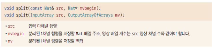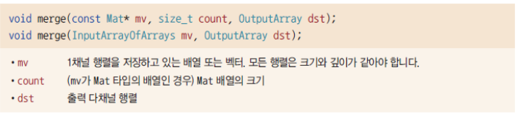 다채널 행렬을 1채널 행렬 여러 개로 변환할 때는 split() 함수를, 다시 1채널 행렬을 여러 개로 합쳐 다채널 행렬 하나를 생성할 때는 merge() 함수를 사용한다.