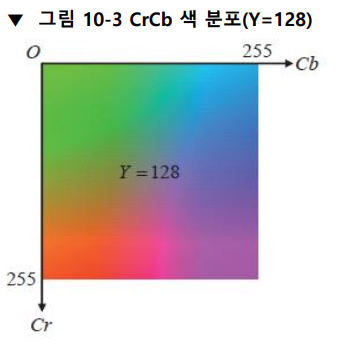 Y 성분을 128로 고정한 상태에서 Cr과 Cb 값에 따른 색상 표현을 그림오르 나타내면 다음과 같다.