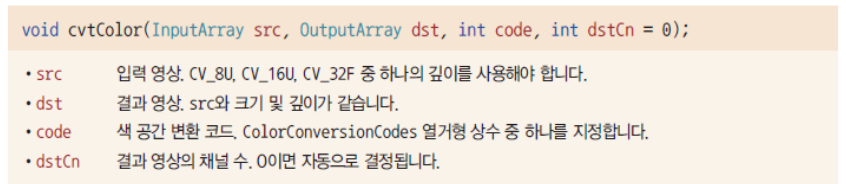 위 함수는 입력 영상 src의 색 공간을 변환하여 결과 영상 dst를 생성하여 반환한다. code 인자에 CololrConversionCodes 열거형 상수를 지정하여 어떻게 색 공간을 변환할지 결정하게 된다.