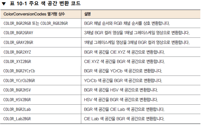 그러나 컬러 영상 처리 관점에서는, RGB 색 공간보다, 색상 구분이 용이한 HSV, HSL 색 공간을 사용하거나, 휘도 성분이 구분되어 있는 YCrCb, YUV 등의 색 공간을 사용하는 것이 유리하다. 따라서 OpenCV는 BGR 순서로 색상이 저장된 컬러 영상의 색 공간을 HSV, YCrCb 등 다른 색 공간으로 변환하는 인터페이스를 제공한다.