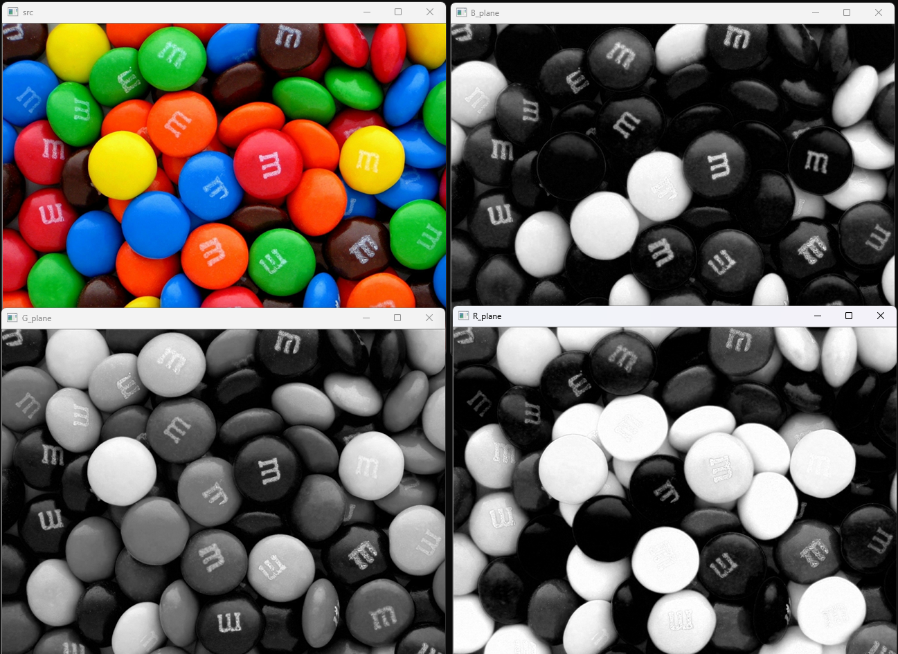 candies src 영상을 vector 자료형인 bgr_planes에 저장하였고, 각 채널 영상을 결과로 나타내면 다음과 같다.