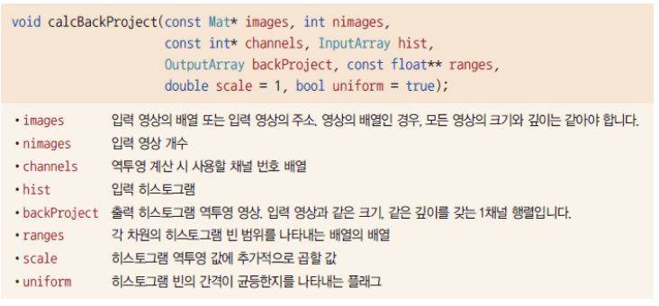히스토그램 역투영은 calcBackProject() 함수를 이용하여 수행할 수 있다.