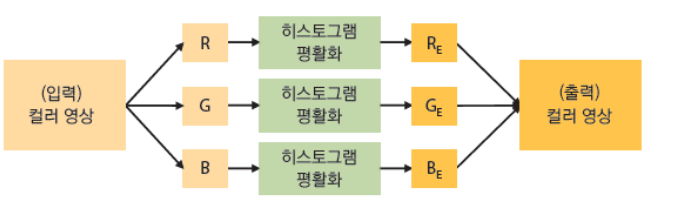 따라서 컬러 영상의 색감은 변경하지 않고, 명암비를 높이고자 하는 경우 영상의 밝기 정보만을 사용해야 한다.