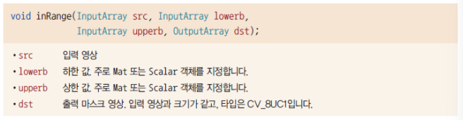 inRange() 는 입력 영상 src의 픽셀 값이 지정한 밝기 또는 색상 범위에 포함되어 있으면 흰색, 그렇지 않으면 검은색으로 채워진 마스크 영상 dst를 반환한다.