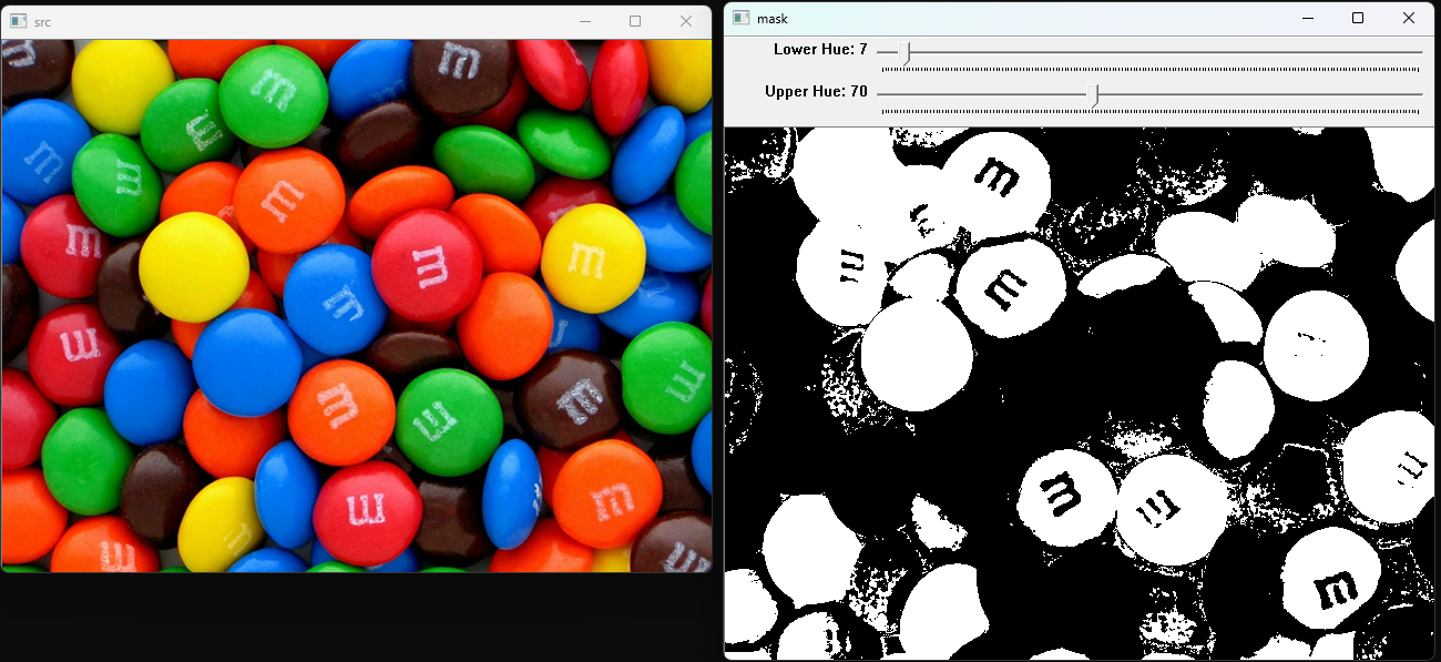 예제는 영상 출력 창에 두 개의 트랙바를 붙여서 사용자가 HSV 색 공간에서 색상의 하한값과 상한 값을 조절하여, 사용자가 설정한 색상 값 범위에 해당하는 영역을 흰색, 그 외의 영역은 검은색으로 표현된 마스크 영상을 화면에 출력하게 된다.