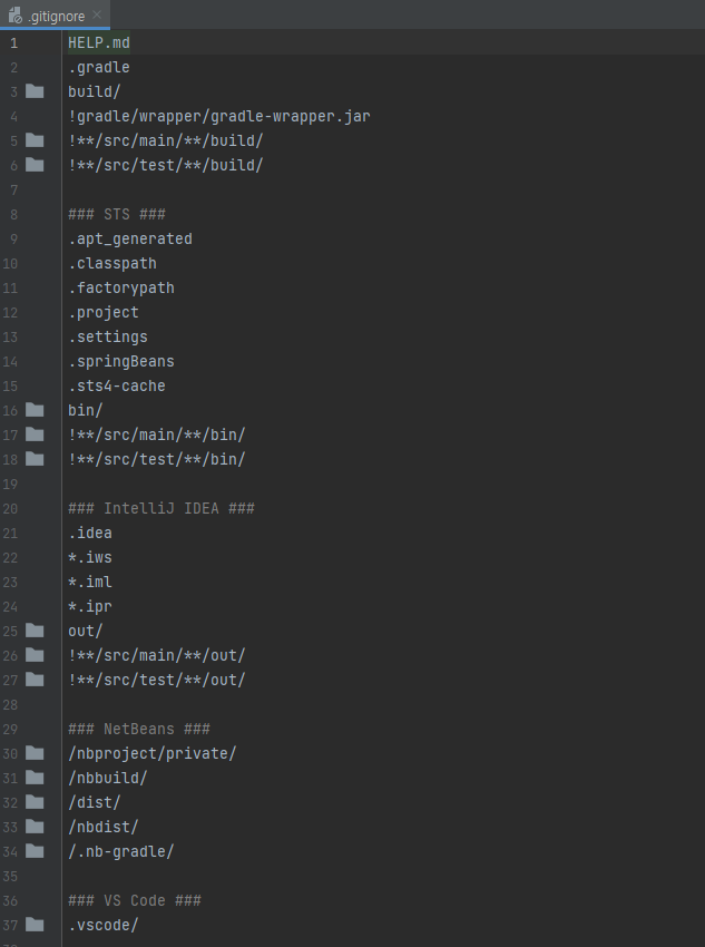 Git에는 필요한 소스 코드 파일들만 올라가고, 빌드된 결과물은 업로드되어서는 안 되기 때문에 .gitignore 파일에 git에 추가해서는 안 되는 파일 명들을 작성해주면 된다. 이 또한 마찬가지로 spring boot에서 자동적으로 초기에 제공해주는 파일이다.