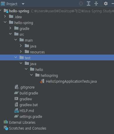src 폴더 내에 main, test 디렉터리가 나타나고, resources 파일에는 java 파일을 제외한 나머지 설정 파일들이 모두 들어가게 된다.