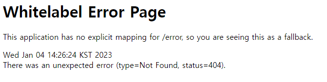 @SpringBootApplication 어노테이션을 인식하며, 스프링 부트에 내장된 Tomcat Web Server을 실행하여 다음과 같은 에러 페이지를 띄우는 것을 확인할 수 있다.