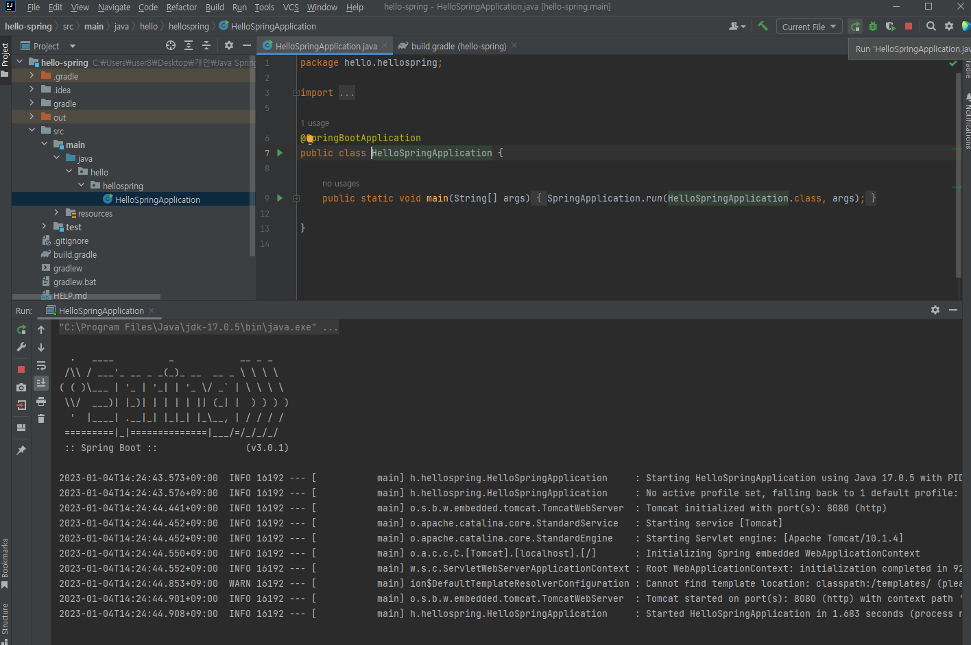 이제, HelloSpringApplication 을 run 하게 되면 다음과 같이 정상적으로 실행이 된다. (JAVA SDK 버전이 올바르지 않은 경우 java 파일 자체를 bulid하지 못하게 되므로 주의!)