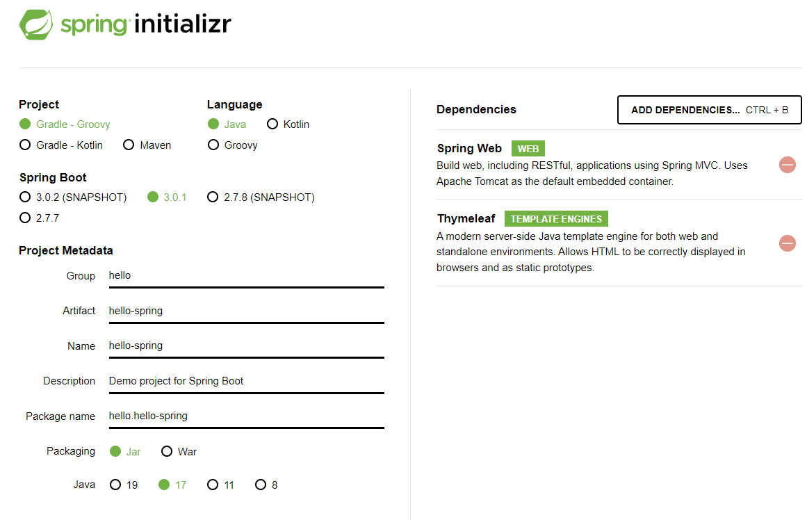 기존에 spring boot 프로젝트를 새로 시작할 때, 다음과 같이 두 가지 라이브러리(Spring Web, Thymeleaf)의 의존성을 추가한 바가 있다.