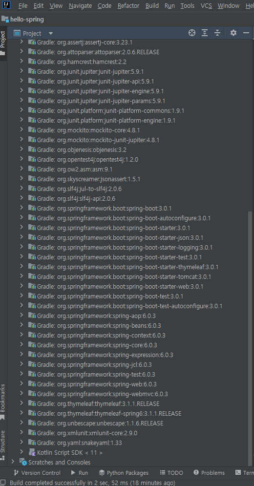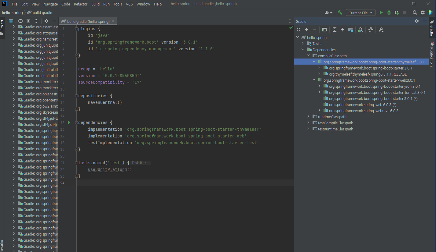 우측의 Dependencies 디렉터리도 살펴보면, spring-boot와 관련된 모든 라이브러리들, spring-core 라이브러리들, 내장형 웹 서버인 tomcat을 비롯해 다운로드 받은 spring-boot-starter-web과 logging 라이브러리들, thymeleaf와 관련된 라이브러리들의 의존성을 확인할 수 있다.