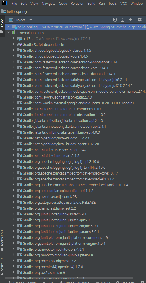 디렉터리 구조에서 External Libraries를 살펴보면, 위에서 추가한 두 라이브러리를 포함하여 무수한 라이브러리의 의존성 파일들을 확인할 수 있다.