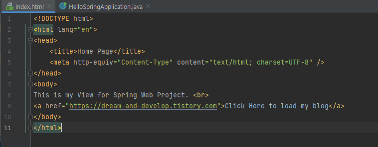 HelloSpringApplication을 실행하고, localhost:8080 경로로 웹 서버를 띄워보면 다음과 같이 index.html 이 로드된 것을 확인할 수 있다.
