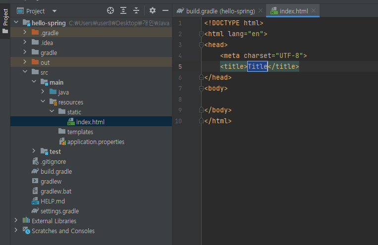 src > main > resources > static 폴더에 index.html을 추가해보도록 하자.