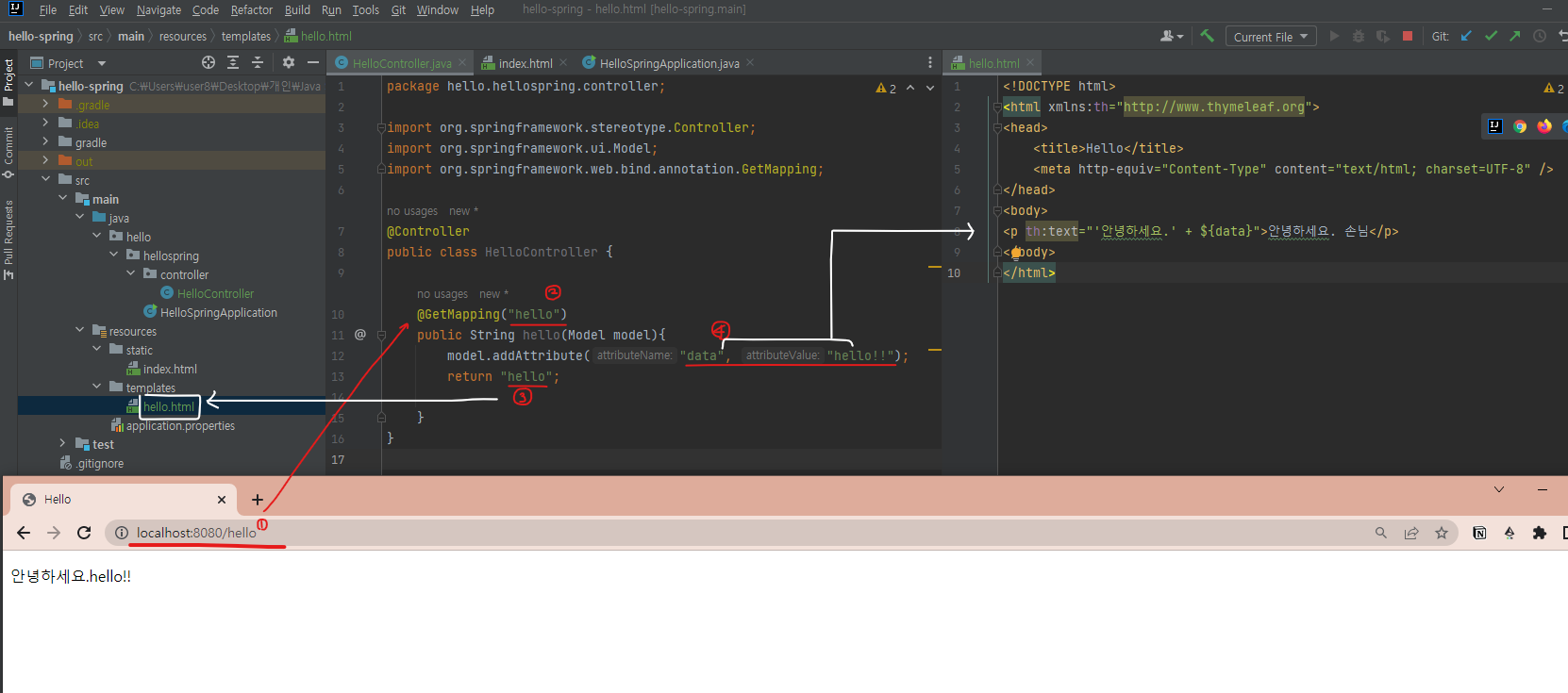 3. 해당 어노테이션에 작성된 메서드를 실행하고, 리턴 값의 "hello" 에 해당하는 "hello.html" 페이지를 띄우게 된다.