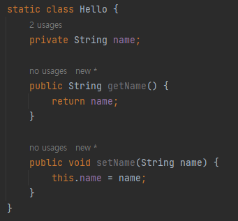 이를 클릭하고 나면 아래와 같이 자동적으로 name 변수에 대한 getter, setter 메서드인 getName(), setName()이 자동적으로 추가된다.
