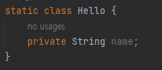 다음과 같이 Hello 라는 정적 클래스 내에 name이라는 String 변수를 만들었다.