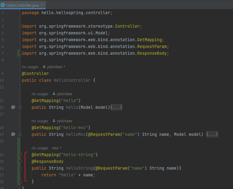 @ResponseBody 어노테이션을 마찬가지로 추가해주고, request parameter 도 마찬가지로 String 형 변수 name을 추가해주자.