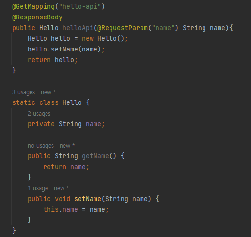 그리고 다시 helloApi 메서드 내에서, hello라는 이름의 Hello 클래스 객체를 선언해주었고,
