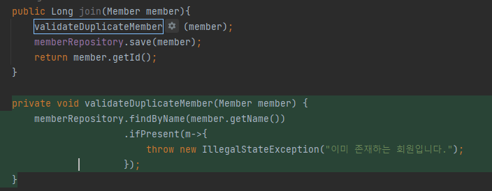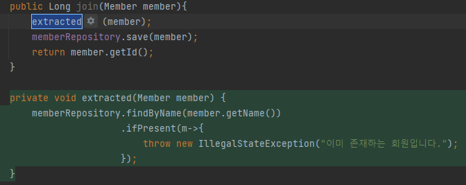이 때 우리는 해당 코드를 "가입하려는 회원 member과 동일한 name 을 갖고 있는 회원이 데이터베이스에 있는지 확인" 하는 기능을 담당하는 메서드로 따로 추출하고자 한다.