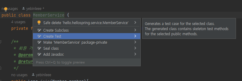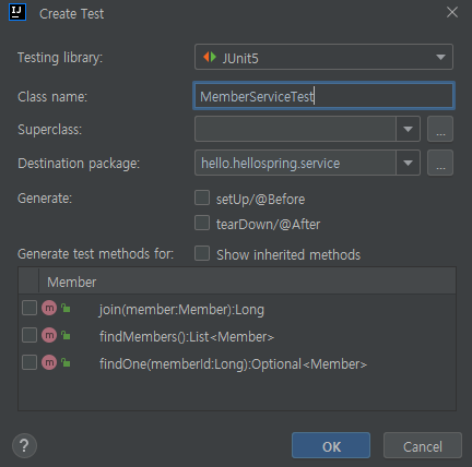 IntelliJ에서 제공하는 Create New Test shortcut 을 이용해 MemberServiceTest 를 만들어보자.