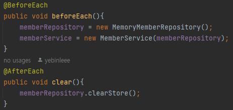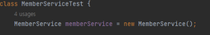 현재 우리는 각 테스트 메서드들이 독립적으로 실행될 수 있도록 MemberService 객체를 MemberServiceTest 클래스 내에 선언하여 사용하기로 했다.