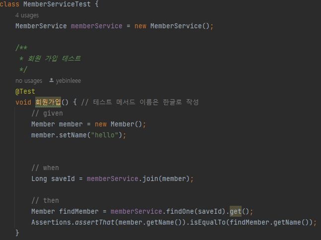 Then 단계에서는 saveId 값으로 memberService를 통해 회원을 찾아 findMember에 해당 객체를 저장하여, 결과적으로 Assertions.assertThat() 을 통해 member의 이름과 findMember의 이름이 동일한지 결과값을 검증하였다.