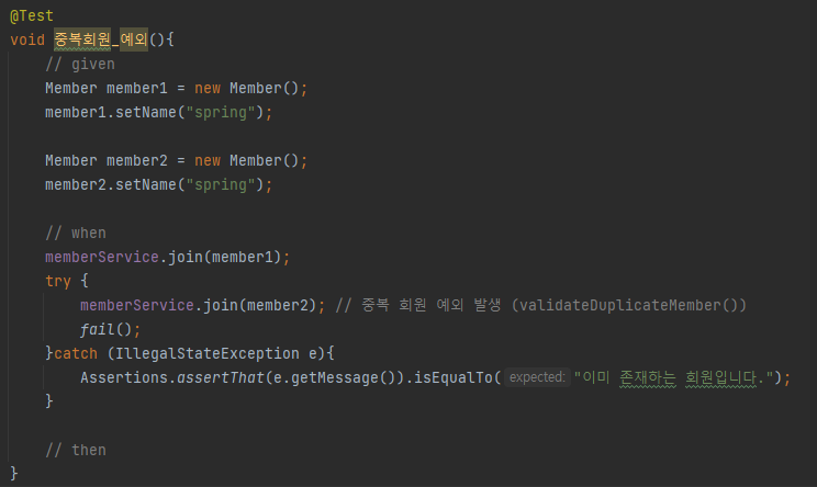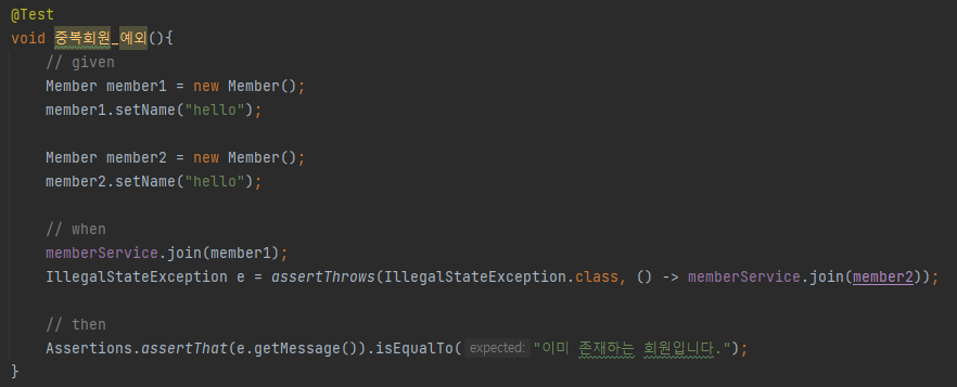 그리고 최종적으로 이 에러 메시지가 "이미 존재하는 회원입니다." 와 동일한지 검증하는 것이 위 테스트의 목표일 것이다.
