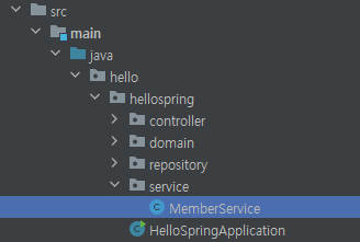 우선 위와 같이 hellospring 패키지 내에 service 패키지를 만들고, MemberService 클래스를 생성하자.